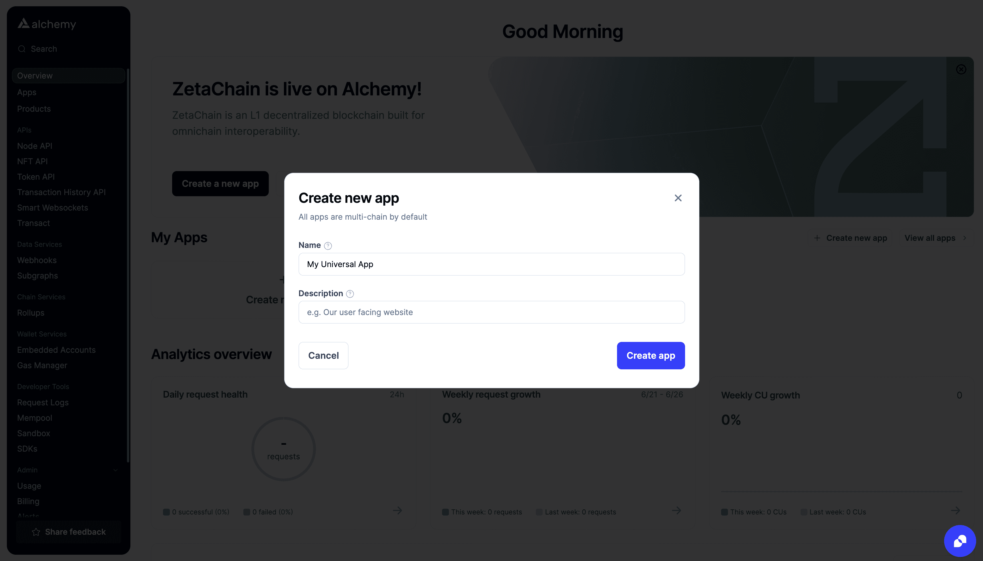 All apps on Alchemy are multichain by default. This means that your dApp immediately has access to all available Alchemy network chains upon creation. You can view all available networks and the related API URLs in the “Networks” tab. You also have access to switch between Mainnet or Testnet, if available.