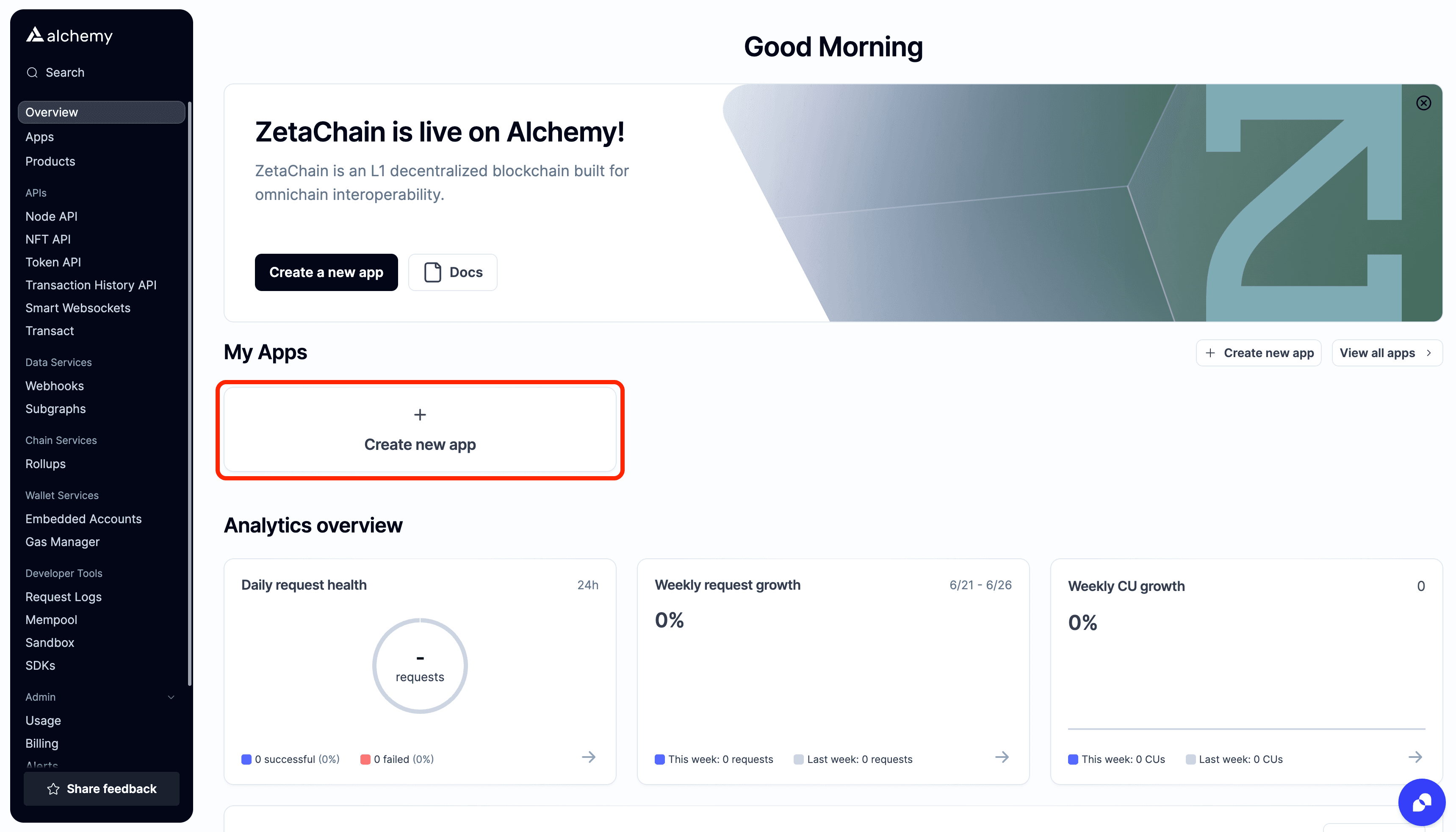 Interactions with your Alchemy RPC instance are protected by an API key. Your API key is automatically generated for you and can be copied from the top-right of your app page.